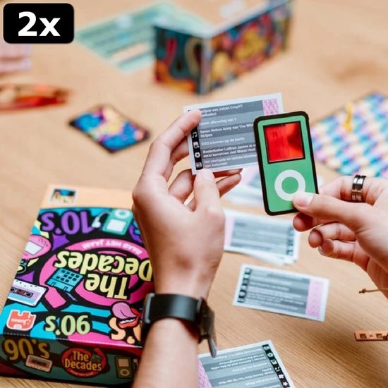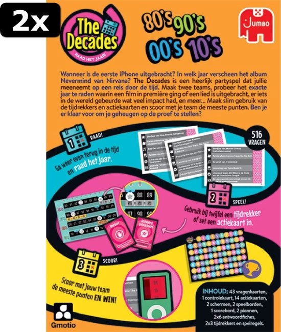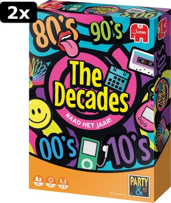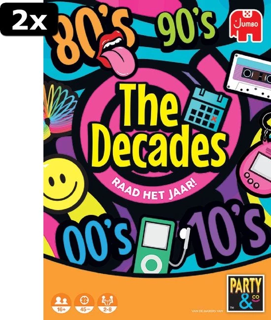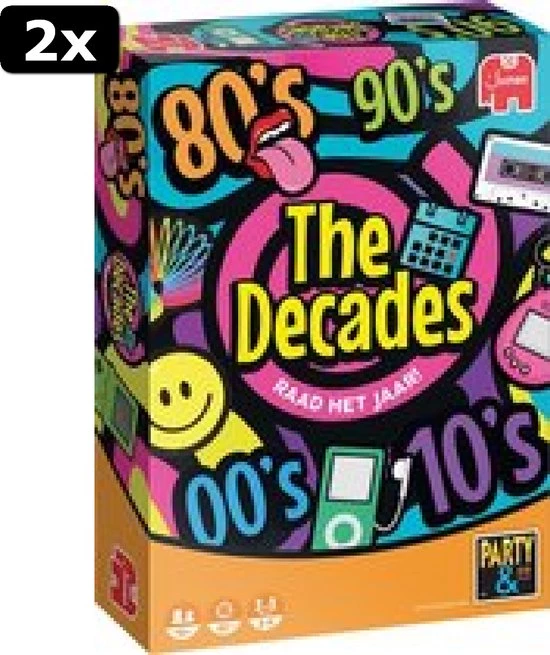 Wanneer is de eerste IPhone uitgebracht? In welk jaar verscheen het album van Nirvana? The Decades van Jumbo is een heerlijk partyspel dat jullie meeneemt op een reis door de tijd! Maak twee teams, neem het tegen elkaar op om de exacte jaartallen te raden en het spel te winnen! Ben jij er klaar voor om jouw geheugen op de proef te stellen?