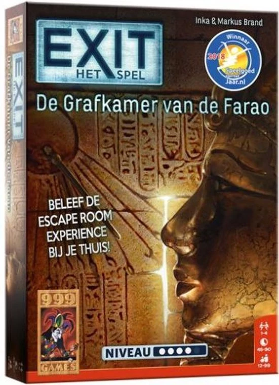 999 Games EXIT – De Grafkamer van de Farao breinbreker Ontsnap zo snel mogelijk uit de griezelige grafkamer. Probeer binnen anderhalf uur alle puzzels op te lossen en alle codes te breken. Alleen dan ontsnappen jullie uit de locatie waar jullie opgesloten zitten. Logisch nadenken en doorzettingsvermogen zijn vereist om dit spel tot een goed einde te brengen. En komen jullie er echt niet uit, dan bevat het spel tipkaarten om jullie op het goede spoor te brengen. Specificaties: Geslacht: unisex Kleur: multicolor Materiaal: karton Afmetingen: 13,2 x 13,2 x 4,2 cm (LxBxD) Aantal spelers: 1 tot 4 spelers Speelduur: 45 minuten Leeftijd: vanaf 12 jaar Inhoud: 83 Kaarten 2 Uitzonderlijke delen 1 Boek 1 Decodeerschijf