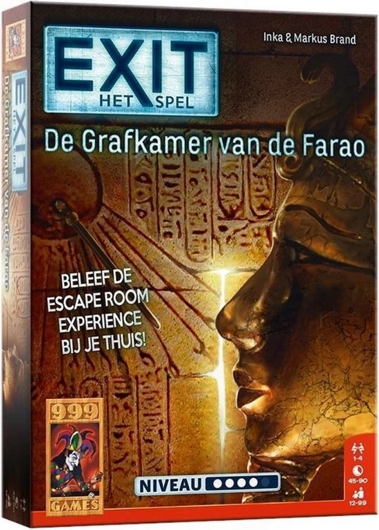 Het uitdagende co?peratieve escape room-spel! Ontsnap zo snel mogelijk uit de griezelige grafkamer. Probeer binnen anderhalf uur alle puzzels op te lossen en alle codes te breken. Alleen dan ontsnappen jullie uit de locatie waar jullie opgesloten zitten. Logisch nadenken en doorzettingsvermogen zijn vereist om dit spel tot een goed einde te brengen. En komen jullie er echt niet uit, dan bevat het spel tipkaarten om jullie op het goede spoor te brengen. EXIT: De Grafkamer van de Farao is maar ??n keer speelbaar omdat het speelmateriaal moet worden beschreven, gevouwen of afgescheurd. Maar net als in een echte escape room garanderen we een zeer intense puzzel- en speelervaring! De puzzels zijn vrij pittig. Daardoor is het spel vooral geschikt voor fervente puzzelaars en escape room-liefhebbers. Niveau: professional