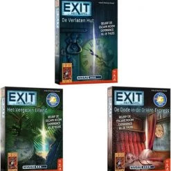 Exit is het uitdagende co?peratieve escape room-spel! Ontsnap zo snel mogelijk uit de verlaten boshut. Probeer binnen anderhalf uur alle puzzels op te lossen en alle codes te breken. Alleen dan ontsnappen jullie uit de locatie waar jullie opgesloten zitten. Logisch nadenken en doorzettingsvermogen zijn vereist om dit spel tot een goed einde te brengen. En komen jullie er echt niet uit, dan bevat het spel tipkaarten om jullie op het goede spoor te brengen. EXIT: De Verlaten Hut is maar ??n keer speelbaar omdat het speelmateriaal moet worden beschreven, gevouwen of afgescheurd. Maar net als in een echte escape room garanderen we een zeer intense puzzel- en speelervaring! De puzzels zijn vrij pittig. Daardoor is het spel vooral geschikt voor fervente puzzelaars en escape room-liefhebbers. Niveau: Gevorderden