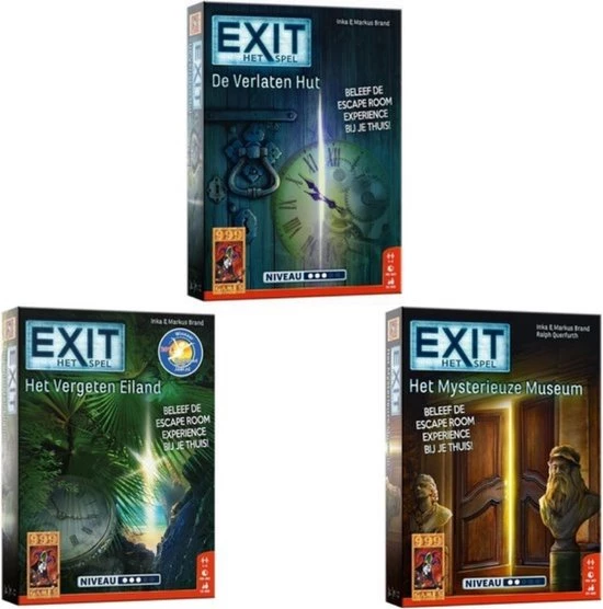 Exit is het uitdagende co?peratieve escape room-spel! Ontsnap zo snel mogelijk uit de verlaten boshut. Probeer binnen anderhalf uur alle puzzels op te lossen en alle codes te breken. Alleen dan ontsnappen jullie uit de locatie waar jullie opgesloten zitten. Logisch nadenken en doorzettingsvermogen zijn vereist om dit spel tot een goed einde te brengen. En komen jullie er echt niet uit, dan bevat het spel tipkaarten om jullie op het goede spoor te brengen. EXIT: De Verlaten Hut is maar ??n keer speelbaar omdat het speelmateriaal moet worden beschreven, gevouwen of afgescheurd. Maar net als in een echte escape room garanderen we een zeer intense puzzel- en speelervaring! De puzzels zijn vrij pittig. Daardoor is het spel vooral geschikt voor fervente puzzelaars en escape room-liefhebbers. Niveau: Gevorderden
