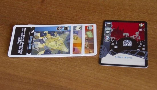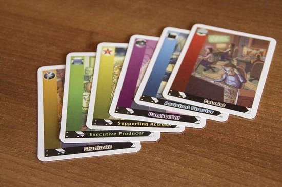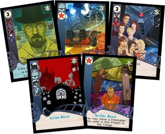 Movies need skills, based on their difficulty. Tv series need a defined number of skills while excluding some in particular. Commercials need specialties, not specific skills, whereas awards need exactly the skills shown on them and nothing more. Finally, there is also the trilogy in which all players can place filmmakers in secret during the course of the whole game and gain fame at the end according to the skills played.