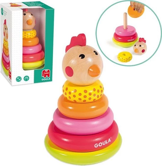 Zet de schijven in de juiste volgorde op de standaard en zie een super leuke kip verschijnen. De schijven hebben leuke felle kleurtjes.