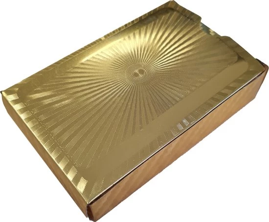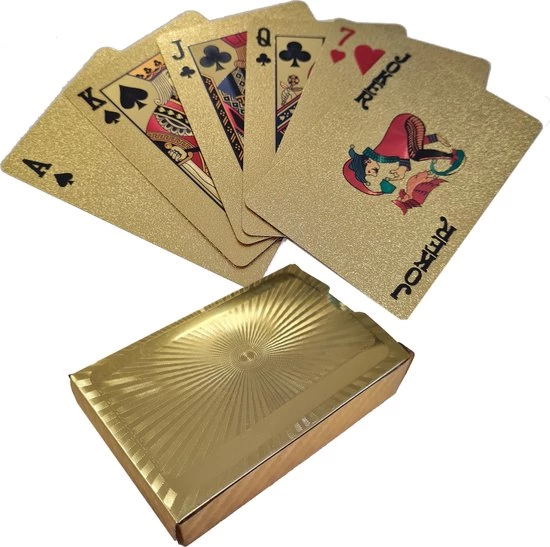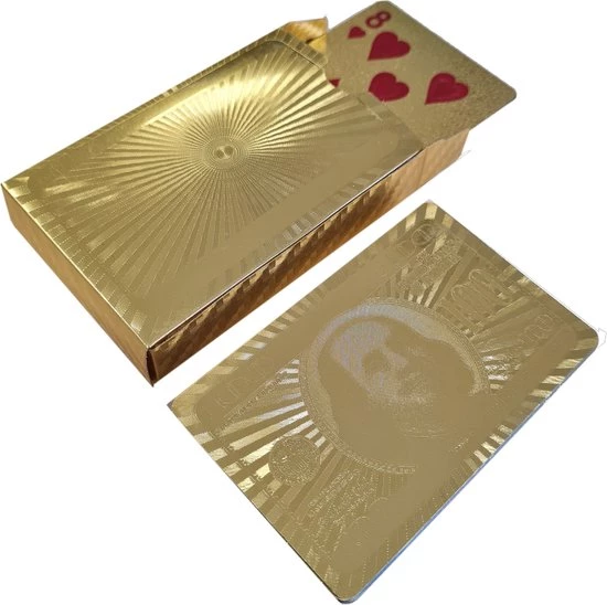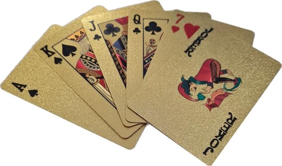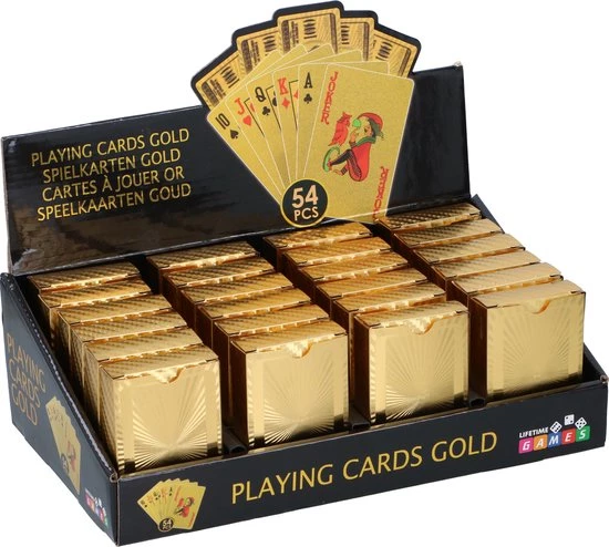 3x Pakjes gouden/goudkleurige speelkaarten 54 stuks van geplastificeerd karton. Wordt geleverd in een luxe doosje. Let op: dit is geen speelgoed en niet geschikt voor kinderen.