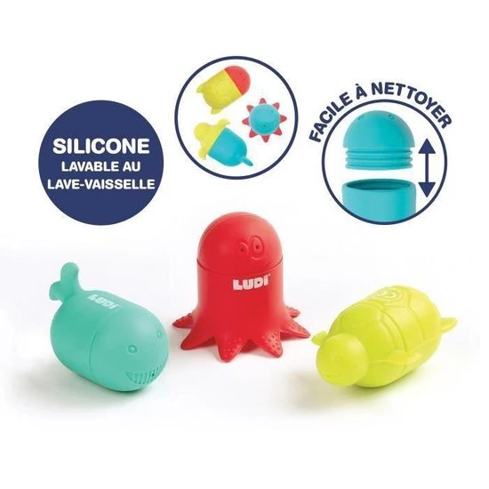 Deze kleine eenvoudige badspeeltjes drijven en hebben een gat om het water te laten spuiten. Om ze goed te wassen en schimmelafzettingen te voorkomen, kunt u ze verwijderen en laten drogen voor het volgende bad. Hun grappige ontwerp, speciaal ontworpen voor kleine handen, is gemaakt van zacht en resistent siliconen.