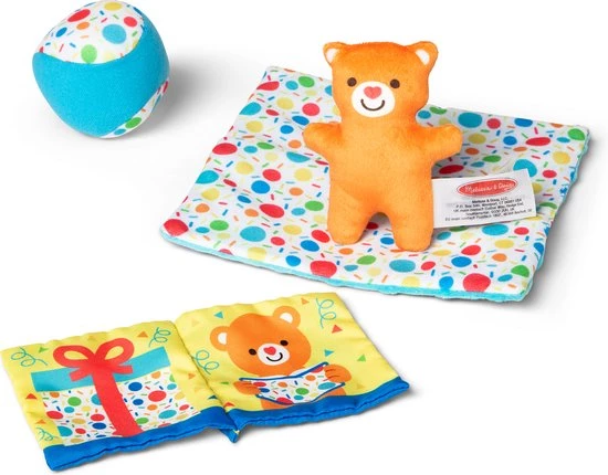 - De 5-delige speelset voor baby’s bestaat uit een houten doosje, een pluchen speelgoedbeer, een zachte bal met belletje, een krakend doekje met meerdere texturen en een stoffen boekje met een vrolijk beertje.