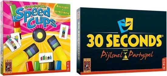Stapelgekke Speedcups – 6 spelers Je krijgt 5 bekers in verschillende kleuren. Elke ronde draait een speler de bovenste kaart van de stapel om. Daarop staan 5 voorwerpen in de kleuren van de bekers horizontaal of verticaal geori?nteerd. Zo kunnen er 5 vogels in een boom zitten of 5 shirts aan een waslijn. Je probeert nu zo snel mogelijk je bekers op of naast elkaar te zetten op de manier waarop dit op de kaart is aangegeven. Ben je als eerste klaar, druk dan snel op de bel. Heb je het goed, dan win je de kaart. De speler met de meeste kaarten wint het spel. Zorg dus dat je rustig, maar tegelijkertijd gefocust bent. Dan maak je de minste fouten en gooi je niet per ongeluk je stapel om. Stapelgekke Speed Cups heeft zeer eenvoudige spelregels, waardoor het snel te leren is. Leuk voor families met kinderen, maar ook voor studenten en veelspelers die iets luchtigs tussendoor willen doen. In deze versie zitten het basisspel en de uitbreiding in ??n doos.