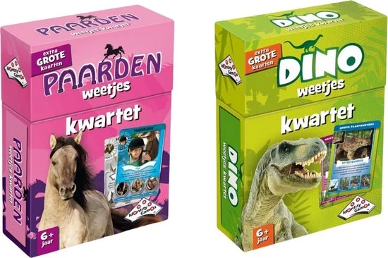 Dino Weetjes Kwartet Kwartetten, een oer-Hollands kaartspel waarin steeds 4 kaarten bij elkaar gespaard worden. Kwartet! Nu over dino’s, afgebeeld op extra grote kaarten. Op deze kaarten staan foto’s en ook nog eens interessante weetjes! Inclusief een superkwartet van 5 kaarten.