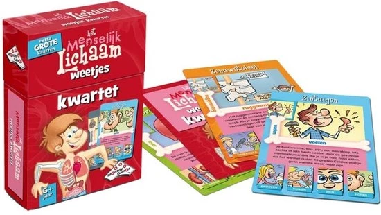 Menselijk Lichaam Kwartet Kwartet is het leukste kaartspel voor de hele familie. Op de kaarten staan de mooiste plaatjes en leukste weetjes. Hoe komt het bijvoorbeeld dat je moet plassen wanneer je water hoort? Inhoud 38 extra grote, gelamineerde speelkaarten+ spelregels. Speelduur 20 min. Aantal spelers 2-4. Leeftijd 6+.