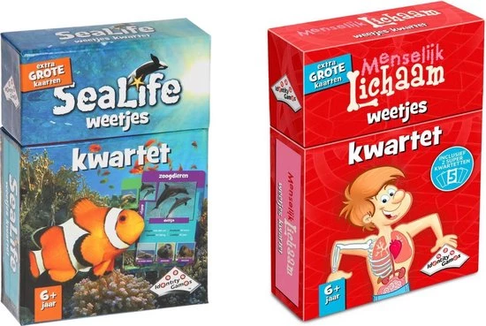 Dit weetjes kwartet is niet alleen een leuk spel.. het is ook nog erg leerzaam. Het Sealife Weetjeskwartet gaat over de dieren uit zee?n en oceanen, afgebeeld op extra grote kaarten.Op deze kaarten staan foto’s en ook nog eens interessante weetjes! Met een superkwartet van 5 kaarten! Hoe oud kan een dolfijn worden? Hoe snel kan een inktvis zwemmen? Hoe zwaar kan een walvis worden?