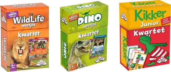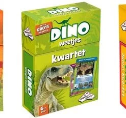 Dino Weetjes Kwartet Kwartetten, een oer-Hollands kaartspel waarin steeds 4 kaarten bij elkaar gespaard worden. Kwartet! Nu over dino’s, afgebeeld op extra grote kaarten. Op deze kaarten staan foto’s en ook nog eens interessante weetjes! Inclusief een superkwartet van 5 kaarten.