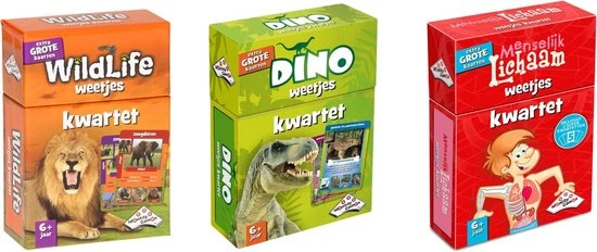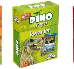 Dino Weetjes Kwartet Kwartetten, een oer-Hollands kaartspel waarin steeds 4 kaarten bij elkaar gespaard worden. Kwartet! Nu over dino’s, afgebeeld op extra grote kaarten. Op deze kaarten staan foto’s en ook nog eens interessante weetjes! Inclusief een superkwartet van 5 kaarten.