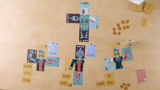 You start with five cards, a head, torso, legs and two arms. Each round you?ll choose whether to spend the Stitches you?ve earned to Scavenge a new part from a common pot, or to Attack your fellow monsters and take one of their limbs instead. As you attack each other you?ll learn new words, giving you more options than just growling and grunting to communicate. Once your monster is strong enough, attack the Abomination to try and win the game, pulling in any other players who have words in common. But beware! The King will fight back?