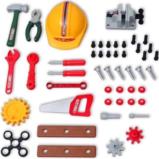 Deze leuke speelgoedwerkbank, met een stevige en duurzame constructie, is perfect voor urenlang speelplezier voor kleine klussers.Door de stabiliteit en het vakmanschap van hoge kwaliteit van de werkbank wordt de veiligheid van de jonge leerlingen gegarandeerd. Kleine bouwvakkers zullen veel plezier hebben tijdens het hameren en schroeven met het levensechte gereedschap. De werkbank is uitgerust met haken en zijpanelen om al het meegeleverde gereedschap en accessoires netjes georganiseerd en binnen handbereik op te slaan. Uw kinderen zullen niet alleen veel plezier hebben van het spelen met deze werkbank, maar ook gestimuleerd worden om spelenderwijs communicatieve en sociale vaardigheden te ontwikkelen. De werkbank is geschikt voor kinderen van 3 jaar en ouder. Montage is erg gemakkelijk. De levering bestaat uit: 1 x speelgoedwerkbank, 1 x priem, 1 x helm, 8 x bouten, 2 x schroevendraaiers, 3 x sleutels, 1 x schroef (lengtr: 6,8 cm), 6 x schroeven (lengte: 5,4 cm), 6 x schroeven (lengte: 4,5 cm), 10 x schroeven (lengte: 3 cm), 2 x stukken speelgoedhout, 1 x zaag, 1 x hamer, 1 x schap, 1 x tandwiel (diameter: 10 cm), 2 x tandwielen (diameter: 6 cm), 1 x sleutel, 1 x tang.