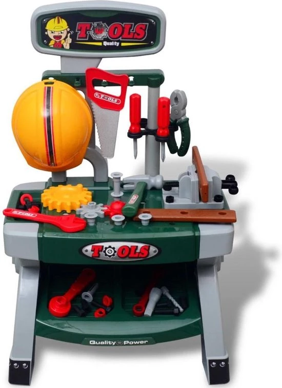 Materiaal: Plastic Kleur: Groen + grijs Afmetingen:44 x 28 x 71 cm(L x B x H) Aangeraden leeftijd: 3 jaar en ouder Gemakkelijke montage De levering bestaat uit: 1 xspeelgoedwerkbank,1 x priem, 1 x helm, 8 x bouten, 2 x schroevendraaiers, 3 x sleutels, 1 x schroef (lengtr: 6,8 cm), 6 x schroeven (lengte: 5,4 cm), 6 x schroeven (lengte: 4,5 cm), 10 x schroeven (lengte: 3 cm), 2 x stukken speelgoedhout, 1 x zaag, 1 x hamer, 1 x schap, 1 x tandwiel (diameter: 10 cm), 2 x tandwielen (diameter: 6 cm), 1 x sleutel, 1 x tang WAARSCHUWING: Niet geschikt voor kinderen jonger dan 36 maanden.