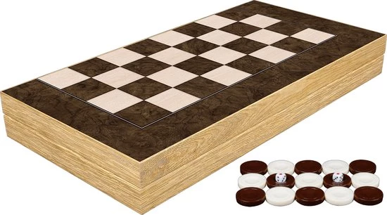 Op de buitenkant van het bord is een 8×8 schaakbord geprint, zodat je ook kunt schaken. Schaakstukken kunnen ook gemakkelijk in de doos worden opgebergd. Schaakstukken worden niet meegeleverd. Voor ??cht dammen is een 10×10 veld nodig. Op een 8×8 bord kun je het spel ook spelen, maar niet volgens de offici??le regels. Er zijn dus 3 spellen te spelen met deze backgammon set.