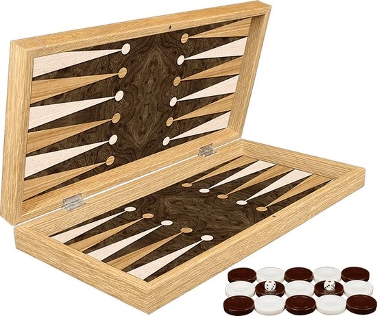 Klassiek Backgammon, of Tavla zoals het in Turkije genoemd wordt is een behendigheidsspel dat je met 2 spelers tegen elkaar speelt. De luxe backgammon set is gemaakt van hout en wordt geleverd inclusief stenen en dobbelstenen. De dobbelsteentjes zijn kleiner dan je misschien gewend bent, precies zoals men het spel in de Turkse straatjes speelt. De doos sluit magnetisch, zodat je alle stenen in het spel kunt opbergen. De sluiting is gemaakt van metalen klips. Het speelveld is krasvast met 95% acryl glanzende UV-lak.